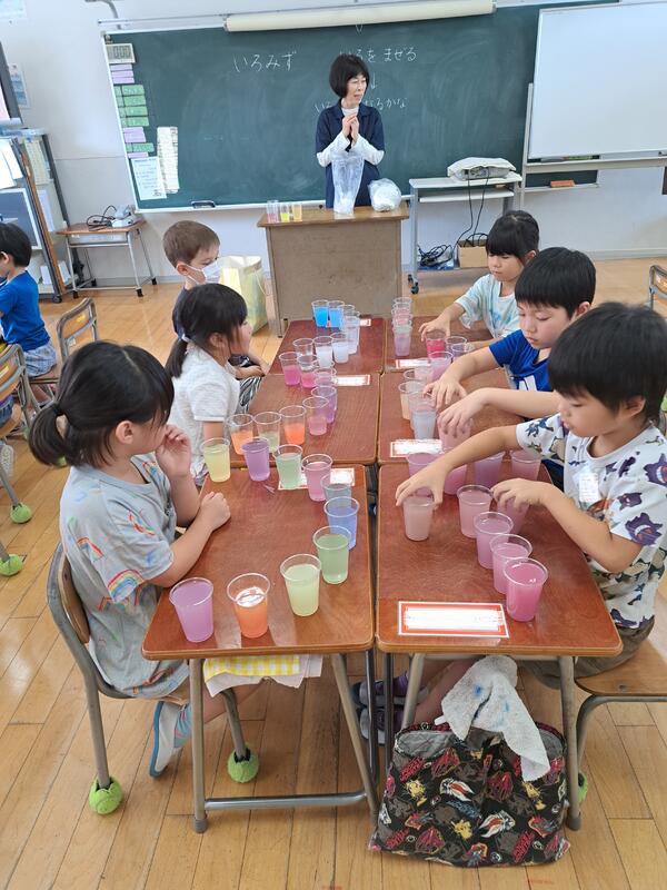小学1年生も面白そうな活動でした。図工で、色水をならべて形を作っているようです。「虹」「海」「ぶどう」など、子どもたちの感性が光ります。