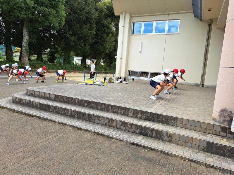 小学5年生が運動場に出てきて、幅跳びの練習を始めました。陸上記録会に向けて、クラスの中で選考会をするのだそうです。みんな気合十分です。