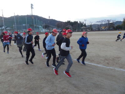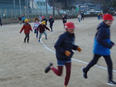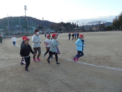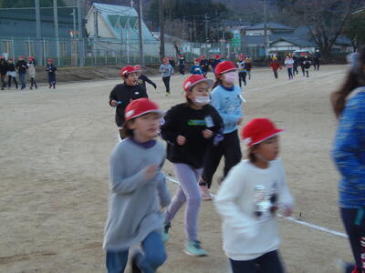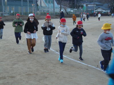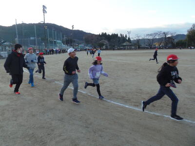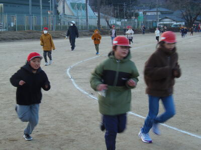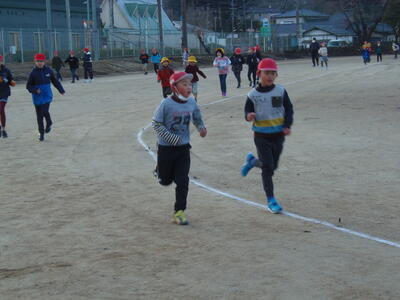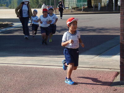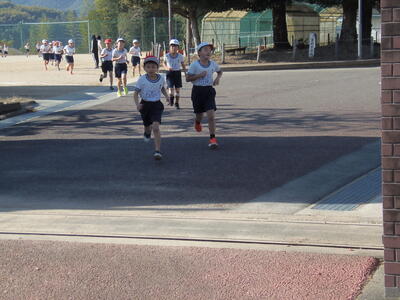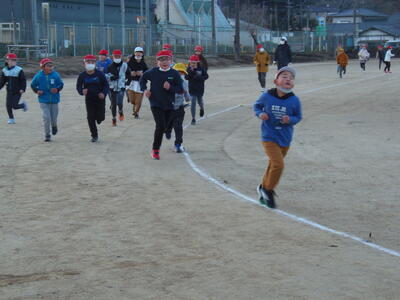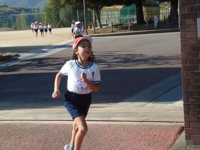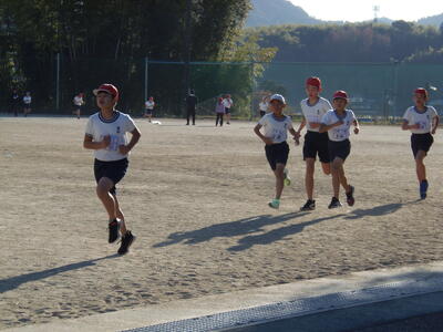 小学生は、5分間自分のペースで走ります。低学年が内側のコース、高学年が外側のコースを走ります。みんな頑張っています。