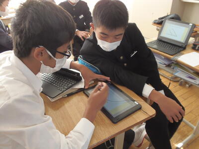最初は、タブレットを使い、一人で考え、友だちと答えを共有しました。