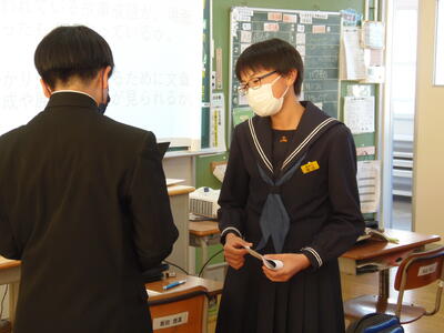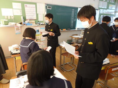 その後、生徒会の任命式がありました。新生徒会長が、生徒会役員に任命書を渡し、旧生徒会役員に感謝状と花束を渡しました。
