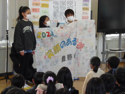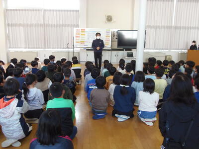 終業集会では、校長先生や2・4・6年生の代表発表が行われ、後期前半の振り返りと冬休みの過ごし方についての話がありました。