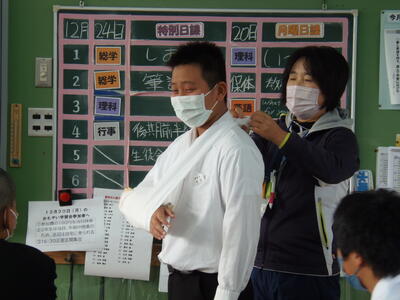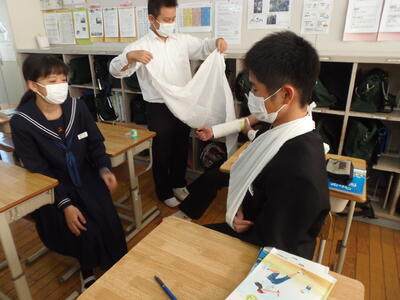 中学2年生は、養護教諭の福岡先生を講師に、止血法や包帯法などを学習していました。