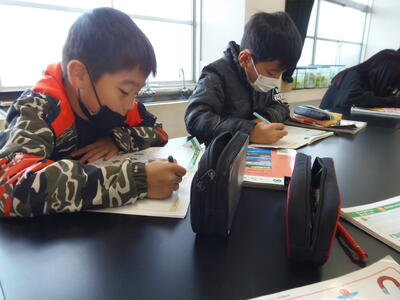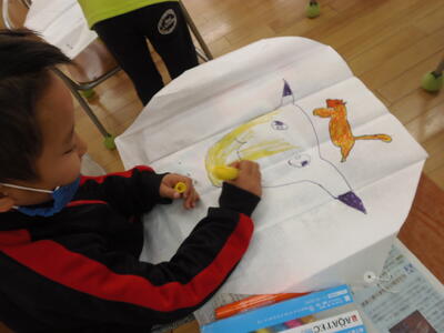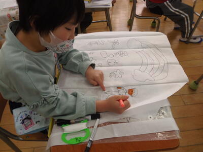 1年生は、凧を作っていました。いろんな絵を凧に書いていました。3時間目は、作った凧をあげるそうです。