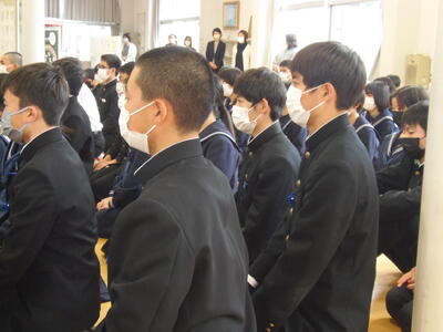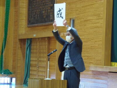 校長先生からは、「成」という字を示され、「為せば成る なさねば成らぬ 何事も 成らぬは人の なさぬなりけり」を例に、今年の目標を絶対にやり遂げるという強い気持ちを持ってほしいと話されました。特に中学3年生が真剣に聞いていました。