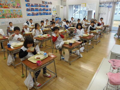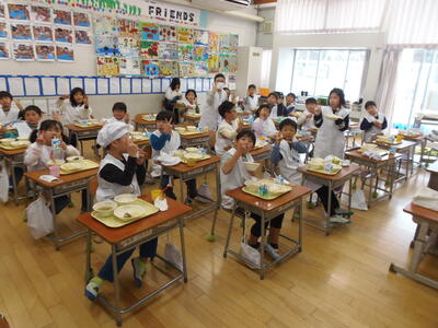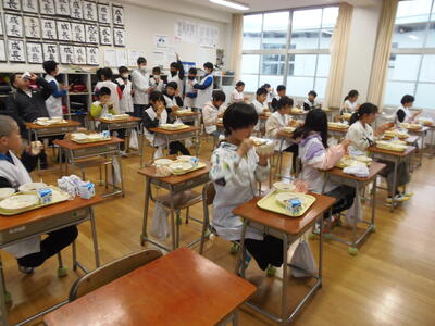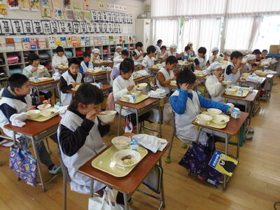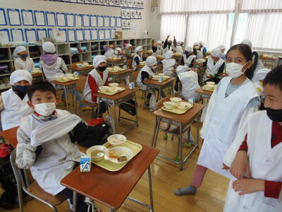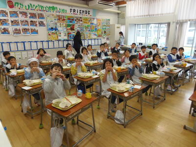 今日の給食は、かつサンド、肉団子スープ、あずきもち、牛乳です。鏡開きということであずきもちがメニューにありました。子どもたちとおいしくいただきました。