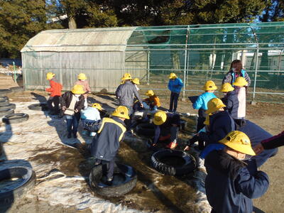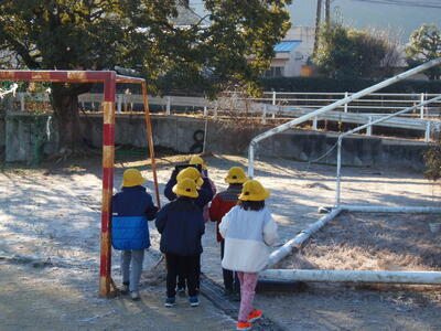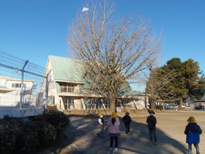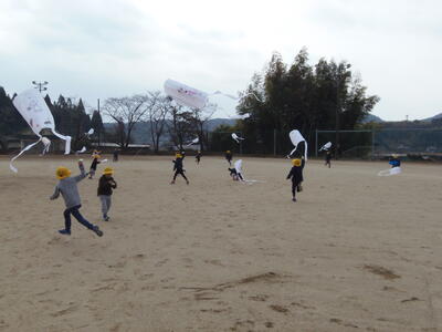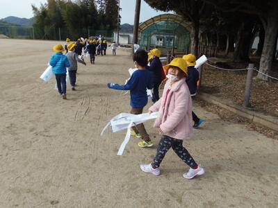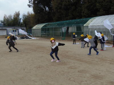 3時間目の小学1年生は、2時間目に作った凧あげをしました。