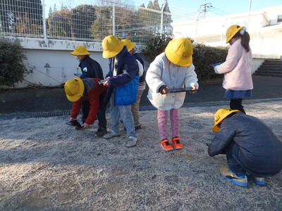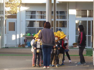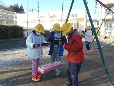 1時間目の小学1年生の授業の様子です。タブレットを持って、冬探しに出かけました。
