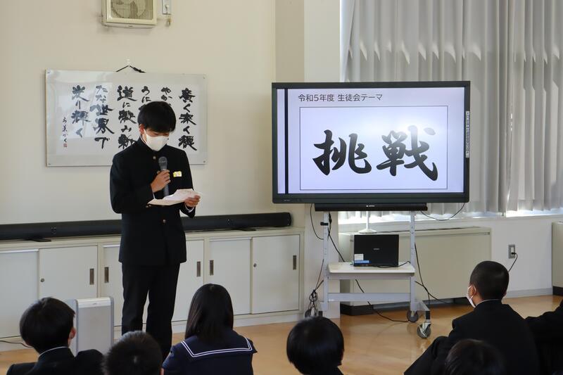 「『挑戦』というテーマには、いろいろなことに挑戦し新しい発見や学びをしたい、失敗をおそれない、自分から行動し誰かの役に立つ経験をしたい、などの思いが込められています。一人ひとりが新しいことに挑戦し、やる気と笑顔に満ちた楽しい学校にしていきましょう。」(生徒会執行部の発表より)