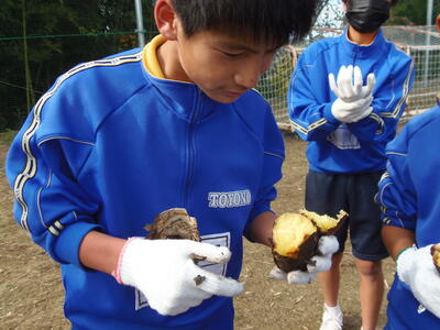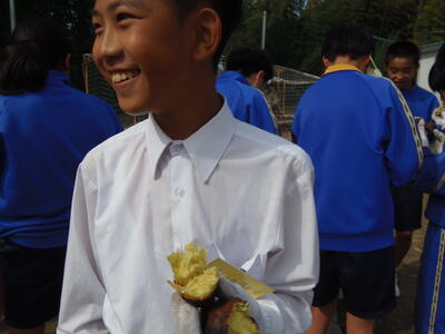 2年生も1個ずつ焼き芋をもらい、作ってくれた中学1年生にお礼を言いました。