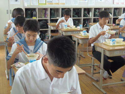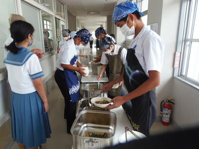 中学2年生が、給食準備をしていました。