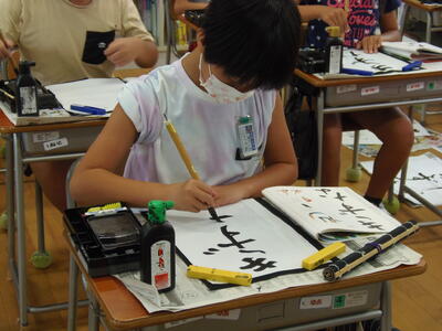 5年生は、習字の授業でした。「きずな」という文字を書いていました。教室に人がいないのかと思うほど、静かでに集中して書いていました。