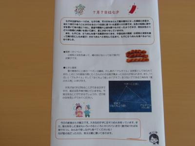 ↓ 今日の給食は、七夕献立で、ゆかりごはん、七夕そうめん汁、ハンバーグきのこソース、七夕ゼリー、牛乳でした。エネルギーは、小学校が610Kcal、中学校が755Kcalです。