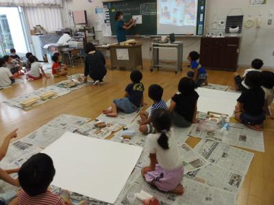 ↓ 小学校1年生の授業の様子です。いろいろな道具を使い、班で作品を作っていました。豊かな発想で協力しながら進めていました。出来上がりが楽しみです。