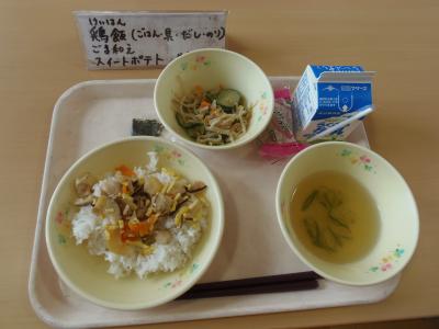 ↓ 今日の給食は、鶏飯、ごま和え、スィートポテト、牛乳です。エネルギーは、小学校603Kcal、中学校760Kcalです。