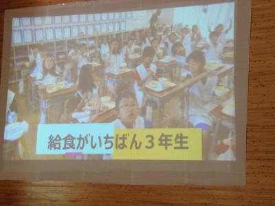 ↓ 次は、給食を食べている様子と感謝の言葉をビデオにとり、ビデオレターとして鑑賞しました。学級のカラーが出ていました。