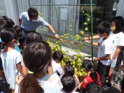↓ ゴーヤのつるが1日で何センチ伸びるか明日調べるそうです。