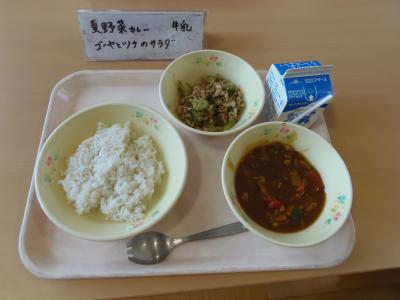↓ 今日の給食は、夏野菜カレー、ゴーヤのツナ和え、牛乳です。エネルギーは、小学校632Kcal、中学校822Kcalです。