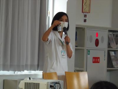↓ 講師の学校薬剤師、坂本先生から薬についていろいろと教えていただきました。