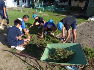 ↓ 朝から体力づくりに取り組んでいる中学生は、前半の最終日としてグラウンド整備を行いました。普段使わせていただいているグラウンドに感謝の気持ちを持って頑張りました。