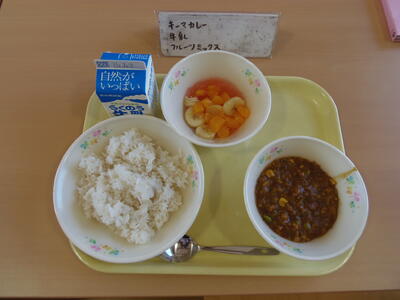 今日の給食は、麦ごはん、キーマカレー、フルーツミックス、牛乳です。子どもたちの大好きなメニューです。
