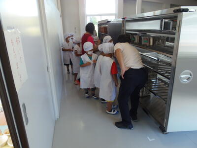 ↓ 今日は、小学1年生と4年生が、給食センターの見学に行きました。1年生は、「給食を残さず食べます」と約束してきたそうです。でも、カレーの中にはピーマンが・・・・。ゴーヤの料理もあります。