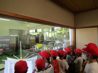 ↓ 窓越しに、給食調理の様子を見学しました。