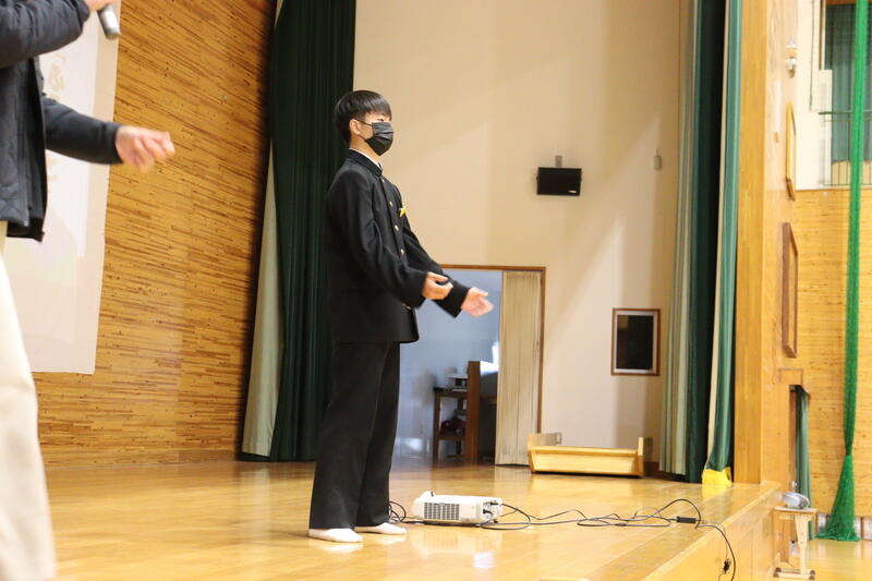 報告会の後、合唱コンクールに向けて、全校音楽を行いました。今年度は全校合唱を行います。曲は「ふるさと」。生徒の歌声が体育館にあふれ、素敵な時間となりました。