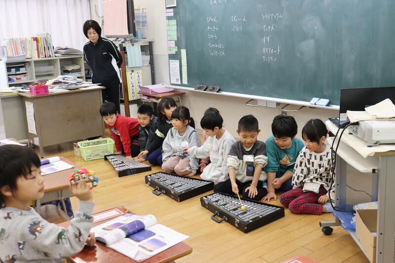 小学1年生は、音楽で、星空をイメージした音作りをしていました。すずやトライアングル、鉄琴の音の出し方を工夫していましたよ。きらきら~っときれいな音でした!