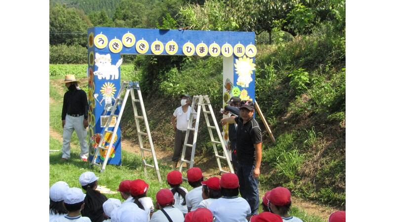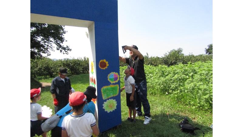 9月5日(木)に、小学3年生がひまわり園実行委員会の方々と一緒にひまわり園の門の飾りつけを行いました。