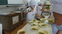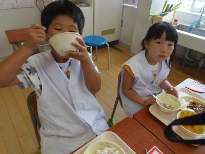 ↓ 今日は、小学1年生と4年生が、給食センターの見学に行きました。1年生は、「給食を残さず食べます」と約束してきたそうです。でも、カレーの中にはピーマンが・・・・。ゴーヤの料理もあります。
