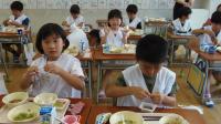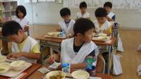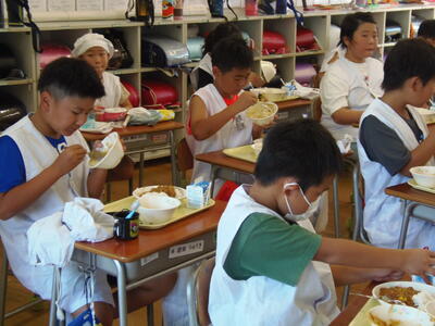 ↓ 豊野給食センターで作る最後の給食をいただいている様子を紹介します。