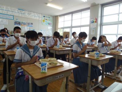 ↓ 中学生が給食をいただいている様子です。給食は、おいしいですが、感染症対策のため、話をできないのが残念です。