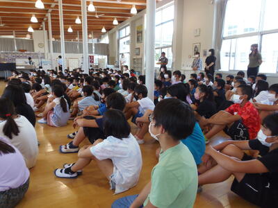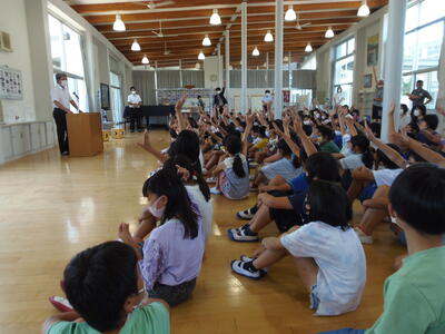 ↓ 前期前半の終業集会を小学校と中学校に分けて多目的ホールで実施しました。