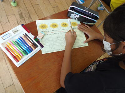 3年生は、ひまわり畑に来ていただいた方へのメッセージを書いていました。このメッセージカードは、ラミネートをして、来てくださった方に配ります。