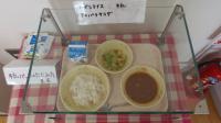 今日の給食は、ハヤシライス、アスパラサラダ、牛乳です。エネルギーは、小学校652kcal、中学校792kcalです。