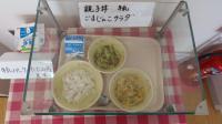 今日の給食は、親子丼、ごまじゃこサラダ、牛乳です。エネルギーは、小学校640Kcal、中学校804Kcalです。