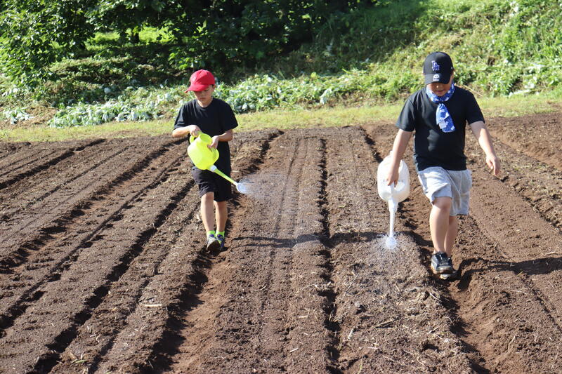 子どもたちは一つの穴に3粒程度の種を入れて軽く土をかぶせていき、最後は、じょうろで水をかけました。