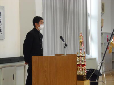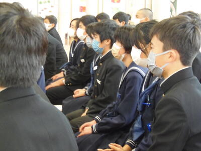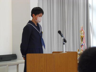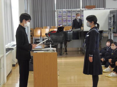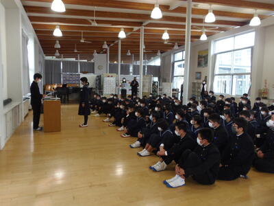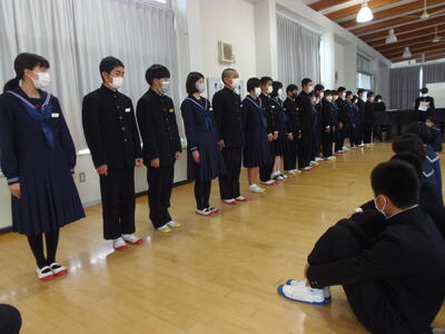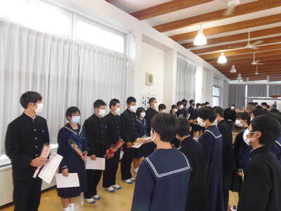 4時間目は、中学校の後期前半終業集会が行われました。小学校同様、持久走駅伝大会、ポップコンテスト、人権、バレー部の大会優勝などの表彰を終業集会の前に行いました。