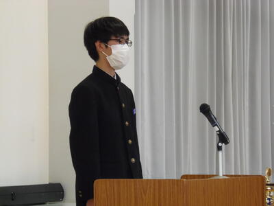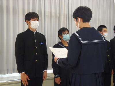 その後、生徒会の任命式がありました。新生徒会長が、生徒会役員に任命書を渡し、旧生徒会役員に感謝状と花束を渡しました。