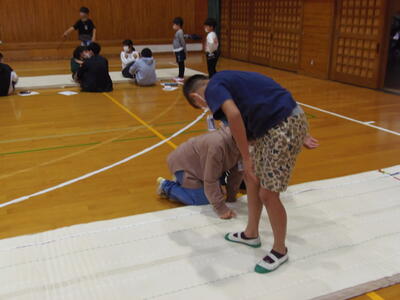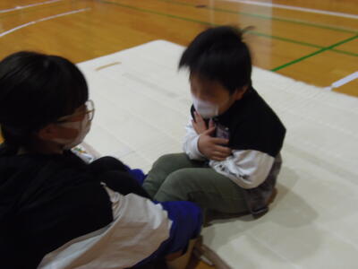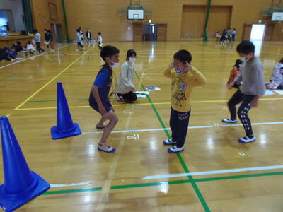 小学6年生が、1年生をエスコートして、体力テストを行っていました。