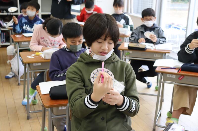小学4年生は、算数で、上田先生、橋口先生と一緒に、裏表に印刷された時計の秘密を探っています。「わかった!」「言いた~い!」みんな意欲的に学習に臨んでいました。