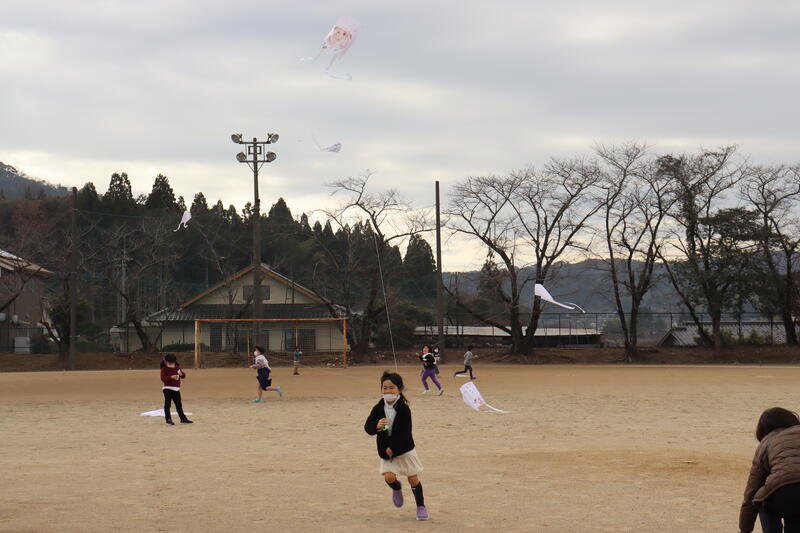 その後、運動場で凧あげをしました!風がなかったので、みんな全速力で走っていました!高くあがりましたよ!