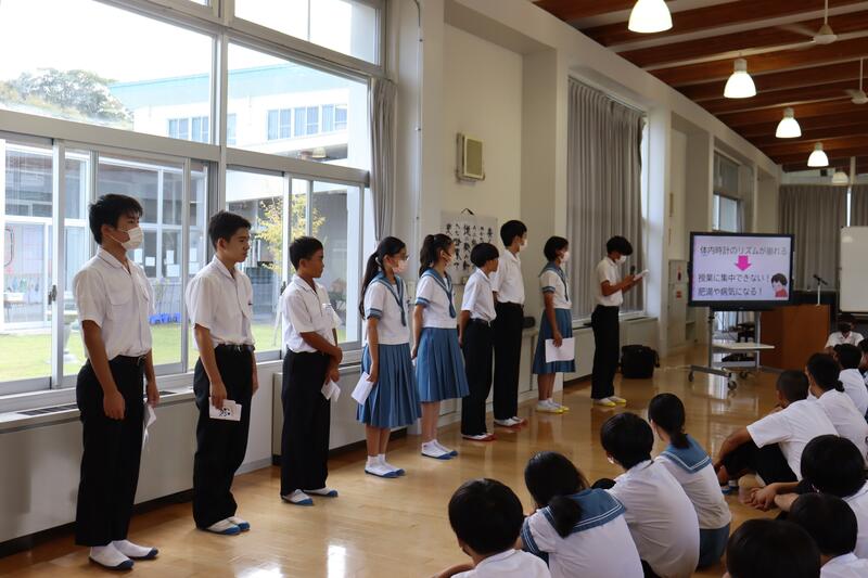 午後から、中学生の生徒集会がありました。今日は、生活委員の発表でした。クイズ形式で、自分の生活を振り返る活動でした。自分の生活習慣やメディアとの付き合い方など、わかっていても改善できない!という人もいると思います。自分の健康を保つことは、自分自身でしかできません。強い意志で改善に向けて取り組んでいきましょう。