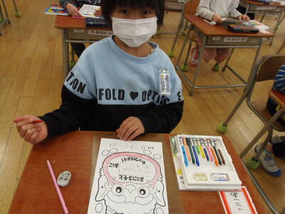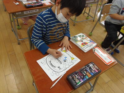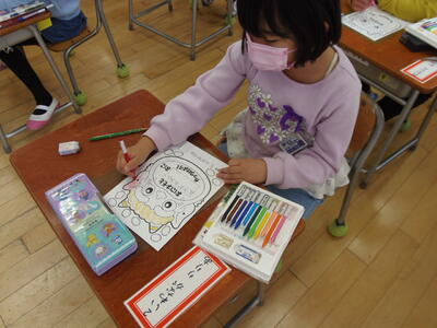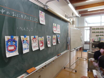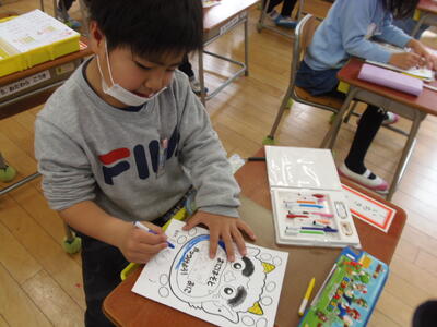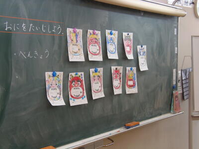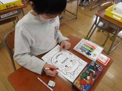 鬼の面に自分のダメなところを記入し、お面に色を塗ります。「お勉強しないとこ」とか「おしゃべりなとこ」とか、「手あそびするとこ」など書いていました。