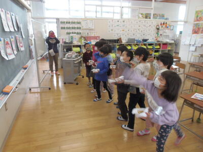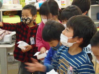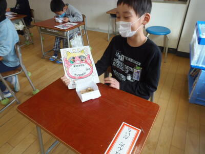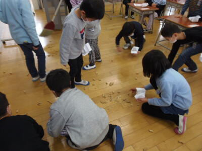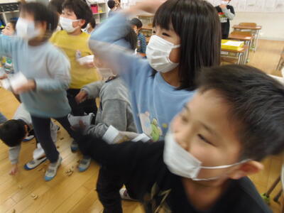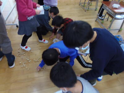 自分の書いた鬼に向かって落花生を投げて鬼退治をしました。(笑)