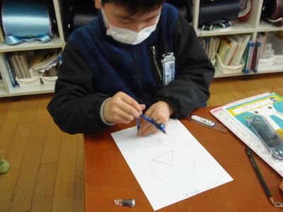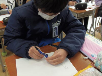 担任の先生の説明を聞いて、二等辺三角形の作図に挑戦していました。