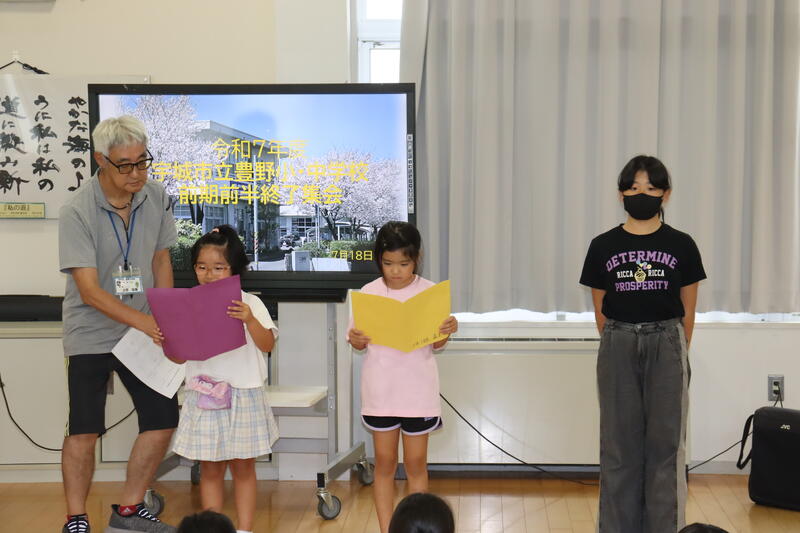 1、3、5年生の代表児童が前期前半の振り返りと前期後半に頑張りたいことについて発表しました。