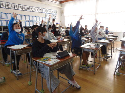担任の先生と井上先生の漫才のようなやり取りの中で楽しい授業が行われていました。