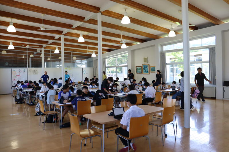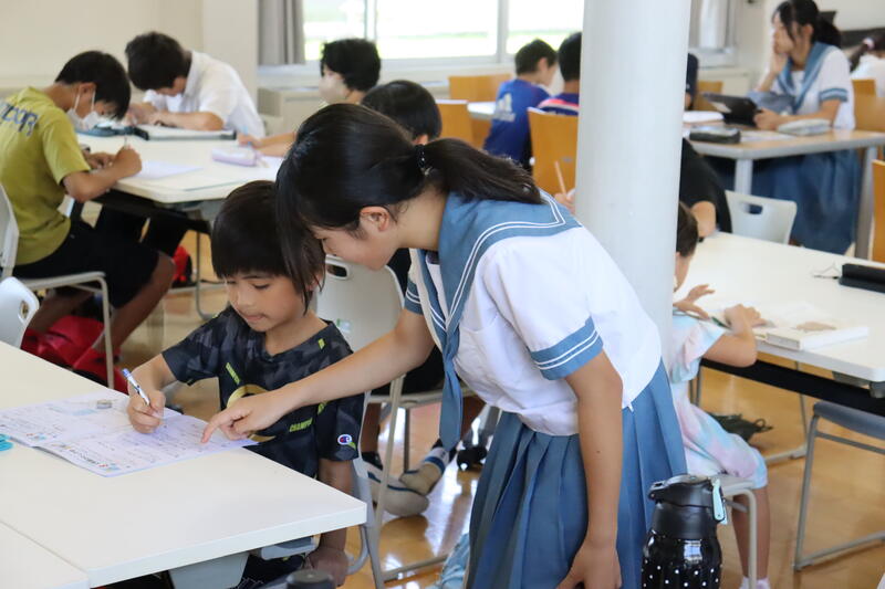 各テーブルに分かれて、小学生が夏休みの宿題などに取り組み、わからないところは中学生に尋ねていました。